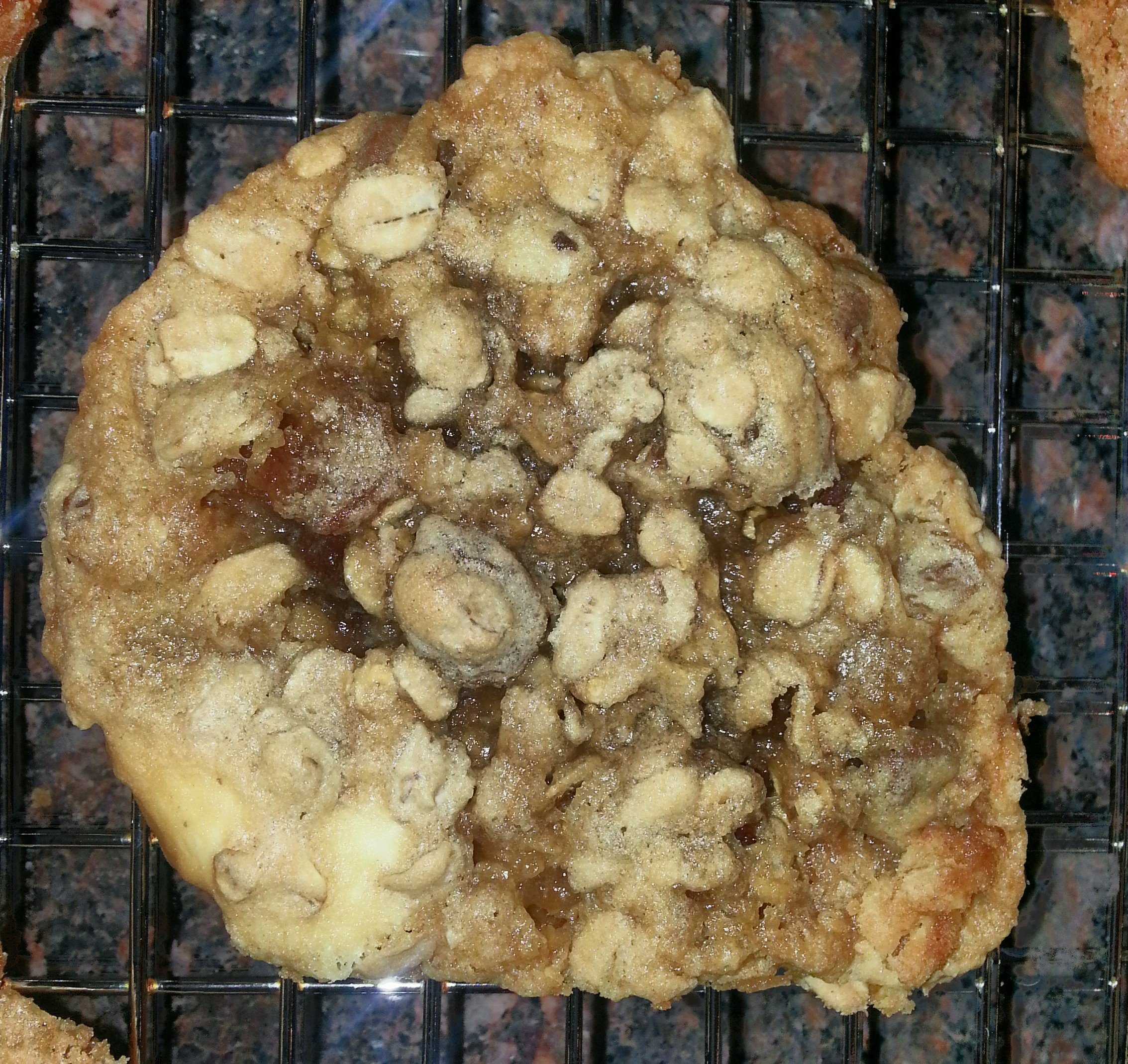 In another bowl, preferably an electric mixer, beat butter and sugars. Beat in vanilla and then eggs. Add the flour mixture, a tablespoon at a time. Once all blended, fold in coconut, pecans, chocolate chips, and raisins. Then, fold in oats.