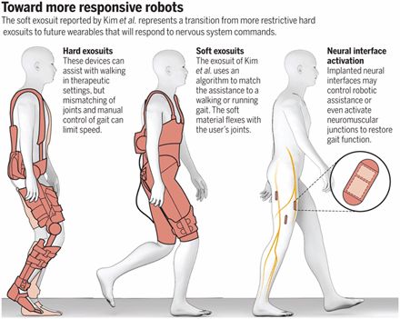 “…it is realistic to think that we will witness, in the next several years, the development of robust human-robot interfaces to command wearable robotics based on the decoding of a representative part of the neural code of movement in humans. The need for wearable technologies that minimally alter human biomechanics will result in a transition from rigid wearable robots to soft exosuits such as the one reported by Kim et al., and, eventually, to implantable neuroprostheses that can influence or