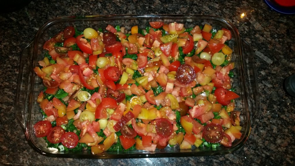 - Layer into a casserole dish starting with rice, followed by beans, scallions, tomatoes, cheese and bacon