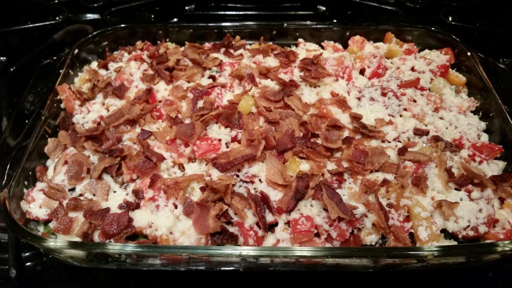- 1 12 oz package of bacon, cooked, then crumbled when crispy
